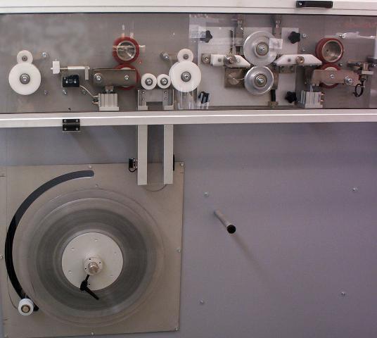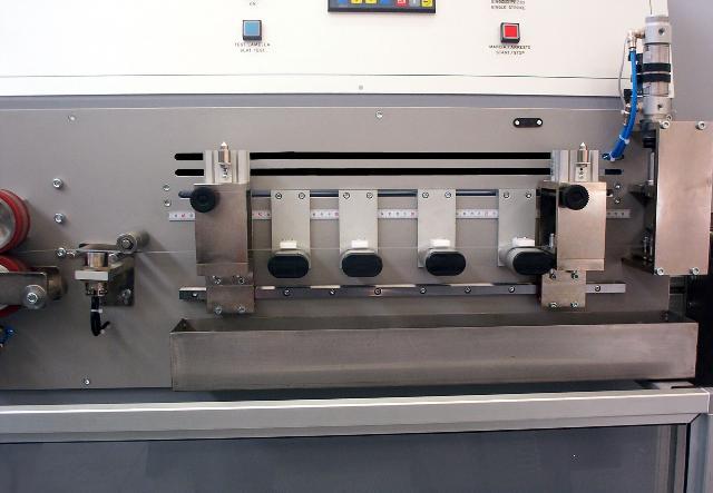 Automatische maschinezur herstellung von horintaljalousien, die 12,5mm, 15/16mm und 25mm breite lamellenschneidet, formt, stanzt und ins terylene einsteckt. Sie kann horizontaljalousien mit eine maximale breite von 750mm produzieren. Die maschine funktioniert mit zwei stanzen die gleichzeitig stanzen ind ist daherraumsparend.